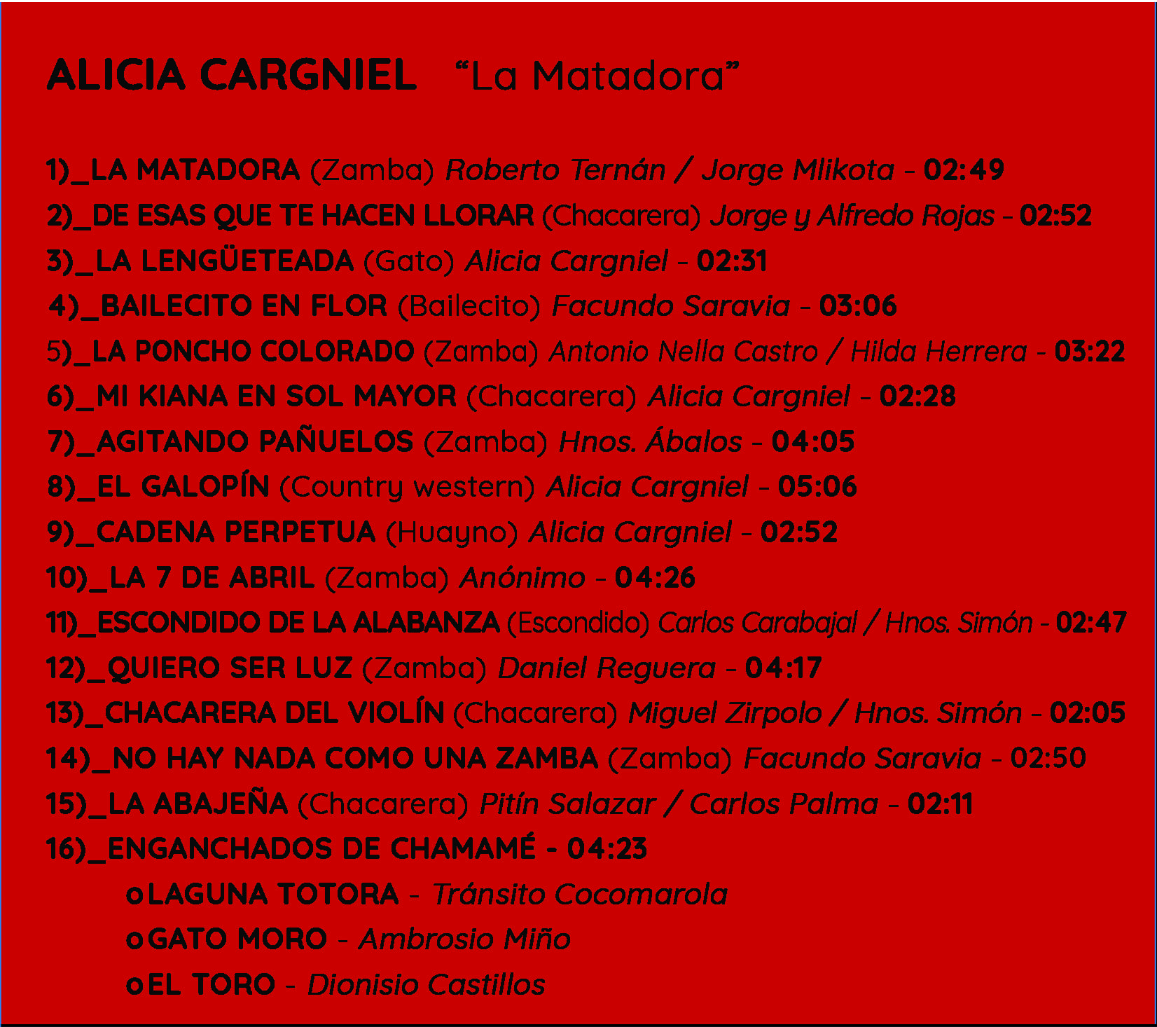 La Matadora mi segundo CD como solista marca mi evolución como artista. Además de estudiar fuerte canto con mi genia coach Mónica Abraham, busqué estar con los mejores. Daniel Villa, el productor musical del Chaqueño, Nico Villalba el genio del sonido, mis tres músicos adorados que la rompieron y todos los que se sumaron que graban con los mejores. También, buscamos hacerlo en el mejor lugar de la Argentina y Sudamérica; los estudios Juanangel, en Lerma, Salta, la casa de Oscar de la Esperanza Palavecino.